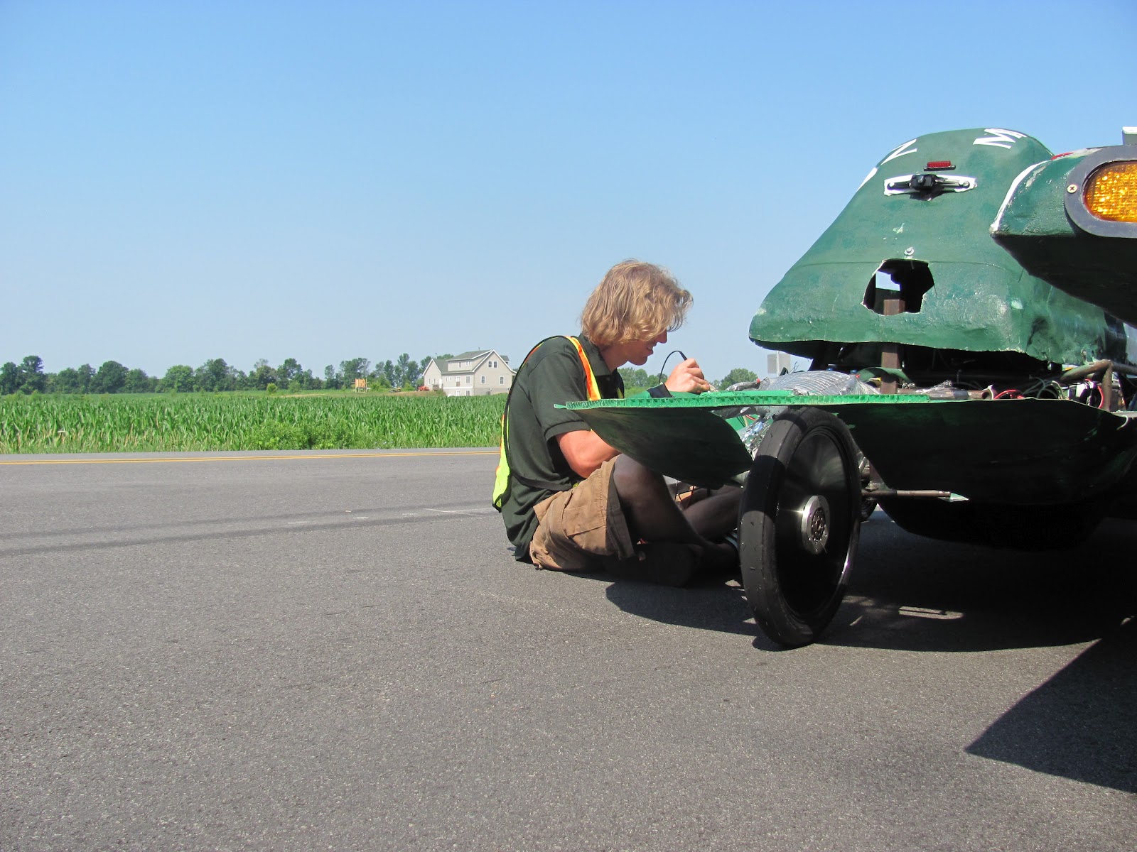 Last summer, we pushed the envelope even further for the MSU Solar Car Team by qualifying for the American Solar Challenge for the first time in Michigan State University history. The American Solar Challenge 2012 was a 1600 mile cross country race from Rochester, New York to St. Paul, Minnesota. To qualify for the ASC 2012, our car had to pass a series of standards within the Mechanical, Electrical, Body, Array, Battery Protection, Driver safety, Dynamics, and Support Vehicle categories. Fortunately, we were able to pass each of those categories, compete in the qualifying track race, and embark on the road race. Unfortunately, the motor controller of our car broke down irrevocably on the first day of the ASC 2012, so we could not continue the competition.